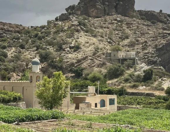 After soaking in the cultural charm of Nizwa, we begin our ascent into the Al Hajar Mountains toward Jebel Akhdar, which translates to “The Green Mountain.” Accessible only by 4WD, the route takes us through winding mountain roads and breathtaking cliffside views. As we climb, the temperature drops, and the landscape transforms into terraced farms, fruit orchards, and stone villages nestled among the peaks.